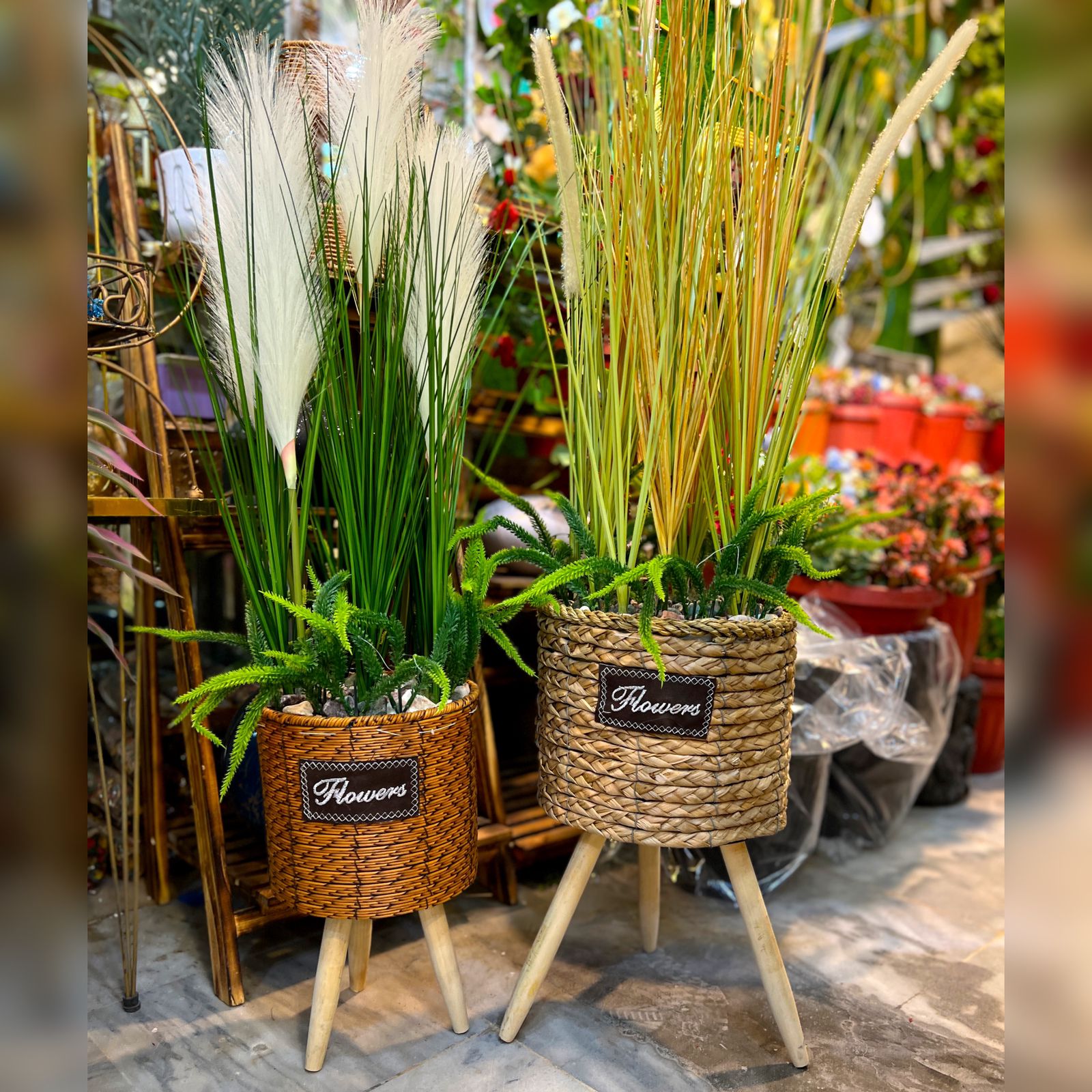 Grass Plant with Woven Basket & Wooden Stand